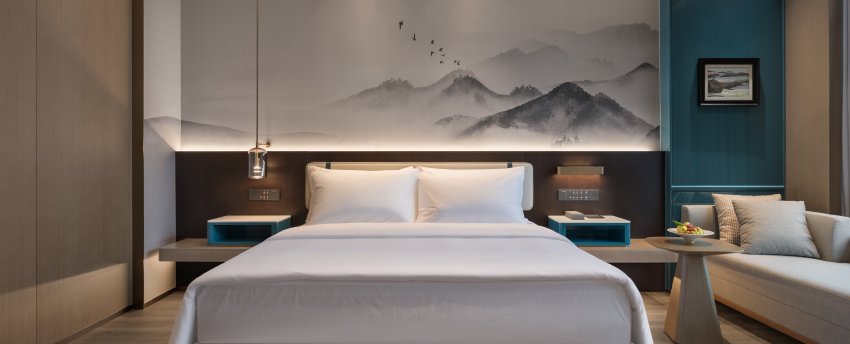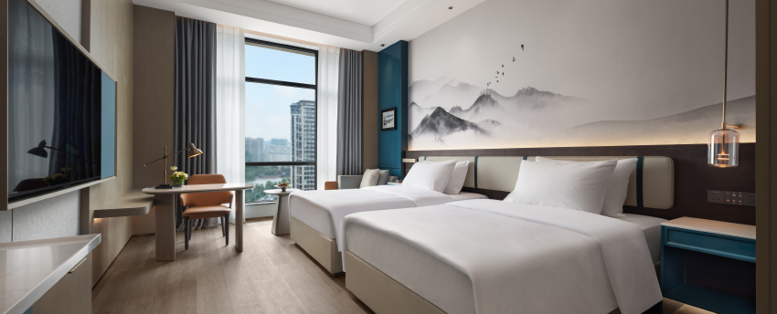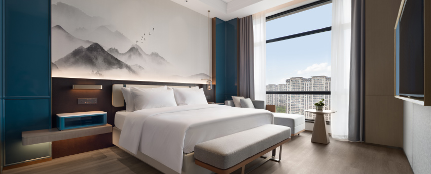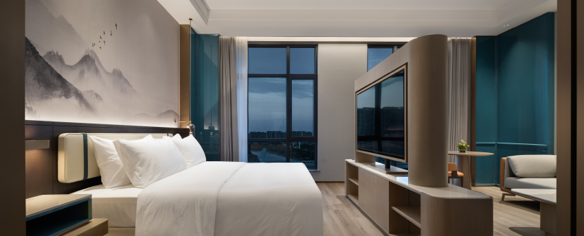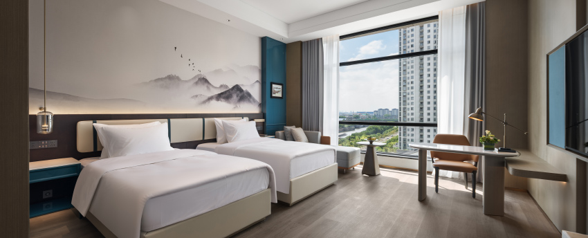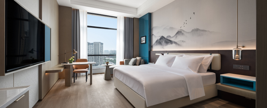 房间分布在6-15层,楼层高,客房面积55平方米,装修轻著典雅,环境温馨静谧。推窗见景,设施设备高端齐全,配备衣帽间、咖啡机、浴缸、保险箱等。洗手间干湿分离,床品考究。更可体验免费高速无线网络、免费健身房、自助洗衣房、智能机器人服务等。