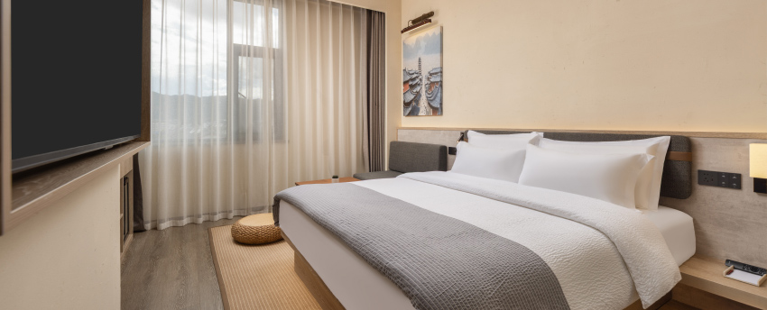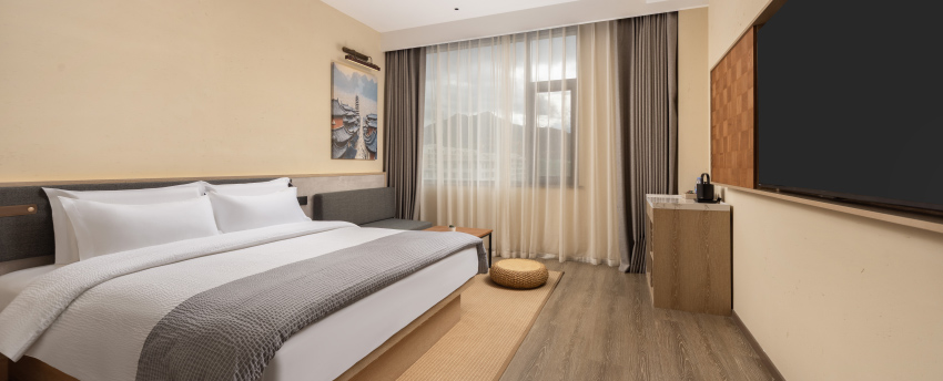 豪华大床房位于酒店2-5层,面积25平方米,设计现代简约,沉稳大气而不失时尚。卫生间干、湿分离,国际专业定制洗护用品配合热带雨林式沐浴体验,配备智能马桶,甄选美标棉织品、国际品牌喜临门床垫。房内配备海信65寸超清液晶电视,一键投屏,畅享完美视觉体验。房间提供冰箱、瓶装水、茶包等,更可体验免费高速无线网络、在线购物商城、智能机器人免费送货,虚拟现实无缝对接。所有房间均为无烟房。