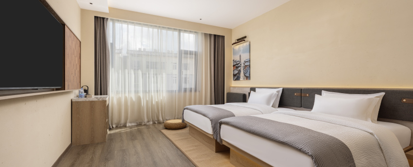 高级豪华双床房位于酒店2-5层,面积38平方米,舒适宽敞,设计现代简约,沉稳大气而不失时尚。卫生间干、湿分离,国际专业定制洗护用品配合热带雨林式沐浴体验,配备智能马桶,甄选美标棉织品、国际品牌喜临门床垫。房内配备海信65寸超清液晶电视,一键投屏,畅享完美视觉体验。房间提供冰箱、瓶装水、茶包等,更可体验免费高速无线网络、在线购物商城、智能机器人免费送货,虚拟现实无缝对接。所有房间均为无烟房。
