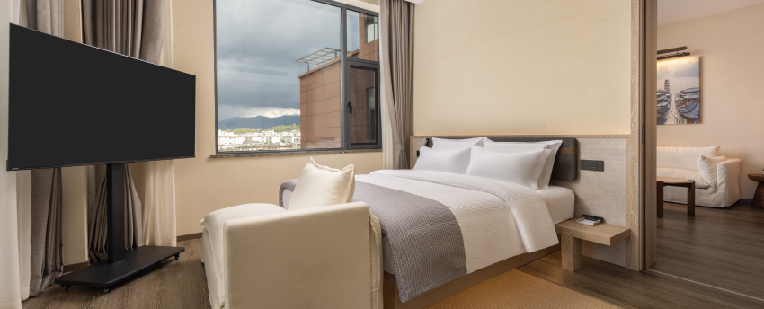 雪山观景套房位于酒店5层,面积56平方米,带浴缸,无敌雪山景观。舒适宽敞,设计现代简约,沉稳大气而不失时尚。卫生间干、湿分离,国际专业定制洗护用品配合热带雨林式沐浴体验,配备智能马桶,甄选美标棉织品、国际品牌喜临门床垫。房内配备2台海信65寸超清液晶电视,一键投屏,畅享完美视觉体验。房间提供冰箱、瓶装水、茶包等,更可体验免费高速无线网络、在线购物商城、智能机器人免费送货,虚拟现实无缝对接。所有房间均为无烟房。