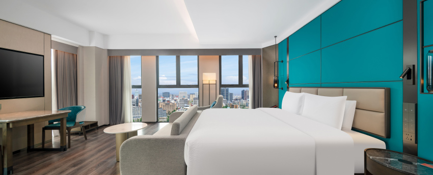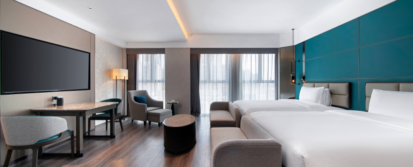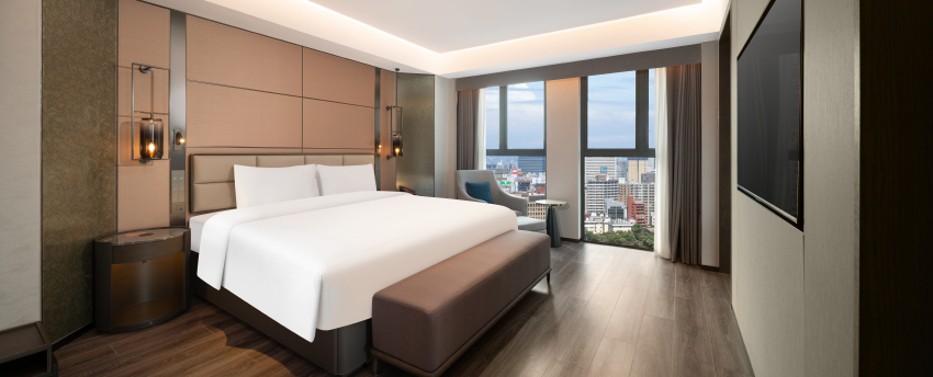 房间位于11-16层,面积45-50平米,设计典雅尊贵大气,客房舒适安静,巧妙点缀赣州文化元素;全明落地窗,卫生间干湿分离,配备国际专业定制洗护用品,以及热带雨林式沐浴体验;甄选美标棉织品、国际品牌金可儿床垫;海信65寸超清液晶电视,一键投屏,畅想完美视觉体验;房间提供免费瓶装水、茶包、免费无线网络、智能机器人服务,将虚拟与现实交融,畅享“所见即所得”的全新旅居体验,让一切需求都能及时响应。所有房间均为无烟房。