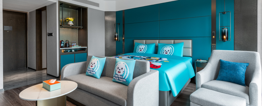 位于酒店12层,面积45-50平米,MOMO亲子主题装饰,配备帐篷、儿童沙发、毛绒玩具等,全明落地窗,带您及家人度过美好亲子时光;儿童专属浴品,让您的家庭旅行童趣盎然。配备国际专业定制洗护用品,热带雨林式沐浴体验;甄选美标棉织品、金可儿床垫;海信65寸液晶电视,一键投屏,畅想完美视觉体验;提供免费瓶装水、茶包、免费无线网络、智能机器人服务,将虚拟与现实交融,畅享“所见即所得”的全新旅居体验。所有房间均为无烟房。