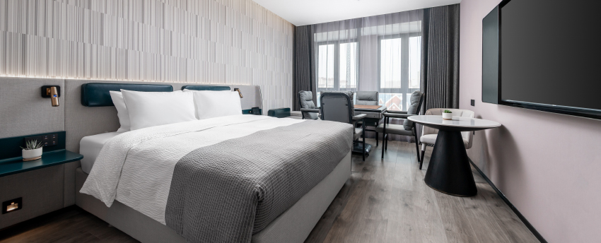 高级大床房位于5-9层,面积24-26平米,房间宽敞,设计现代简约,沉稳大气而不失时尚,卫生间干、湿分离,意大利高端小众洗护品牌Acca Kappa白苔系列洗浴、洗发和护肤用品配合热带雨林式沐浴体验,甄选美标棉织品、国际品牌床垫。房内配备海信65寸超清液晶电视,一键投屏,畅享完美视觉体验。房内空间宽敞,配备衣橱、书桌、沙发,提供免费瓶装水、茶包等,更可体验免费高速无线网络、在线购物商城、智能机器人免费送货,虚拟现实无缝对接。所有房间均为无烟房。