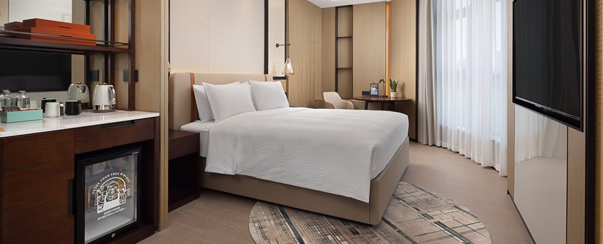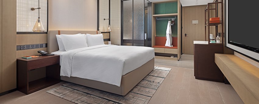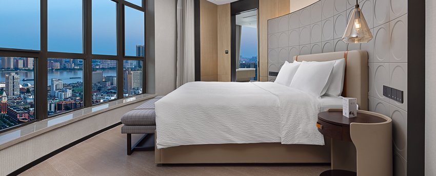 颐华大床房位于酒店6-20层,面积约50-55平米,大胆的撞色系,表达了创新与活力;全明外窗,可欣赏城市景观;卫生间干、湿分离,意大利AccaKappa高端洗护用品配合热带雨林式沐浴体验;甄选美标棉织品、国际品牌金可儿床垫;房内配备65寸超清液晶电视,一键投屏,畅享完美视觉体验;房间免费迷你吧、免费瓶装水、茶包、免费高速无线网络、智能机器人服务,将虚拟与现实交融,畅享“所见即所得”的全新旅居体验。
