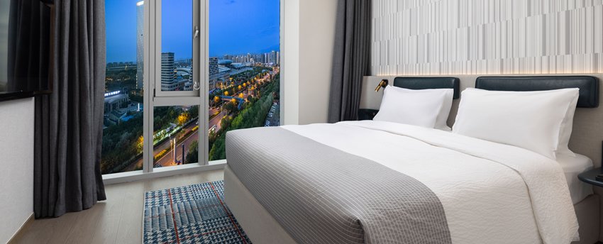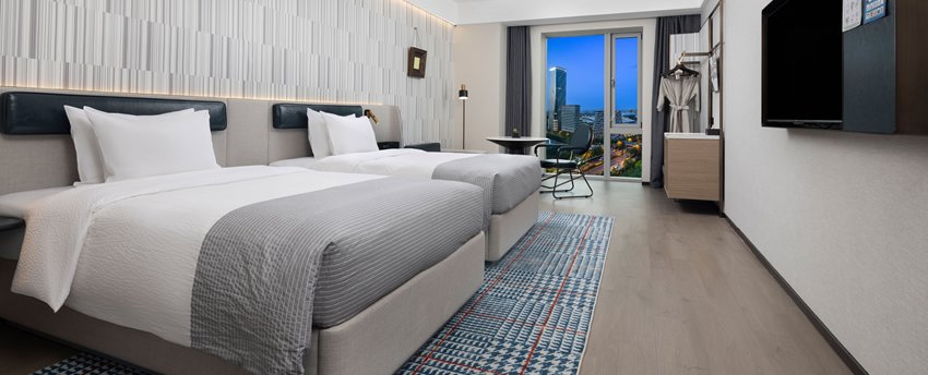 豪华双床房位于5-9层,面积43平米,现代简约设计以暖灰色为主,点缀宝石蓝,沉稳大气又时尚不张扬。房间宽敞,卫生间干、湿分离,意大利高端小众洗护品牌Acca Kappa Mini系列洗浴、洗发和护肤用品配合热带雨林式沐浴体验,甄选美标棉织品、国际品牌“斯林百兰”床垫。房内配备TCL50寸超清液晶电视,一键投屏,畅想完美视觉体验。房内空间宽敬,配备衣橱、书桌、沙发,提供免费瓶装水、茶包等,更可体验免费高速无线网络、在线购物商域、智能机器人免费送货,虚拟现实无缝对接.