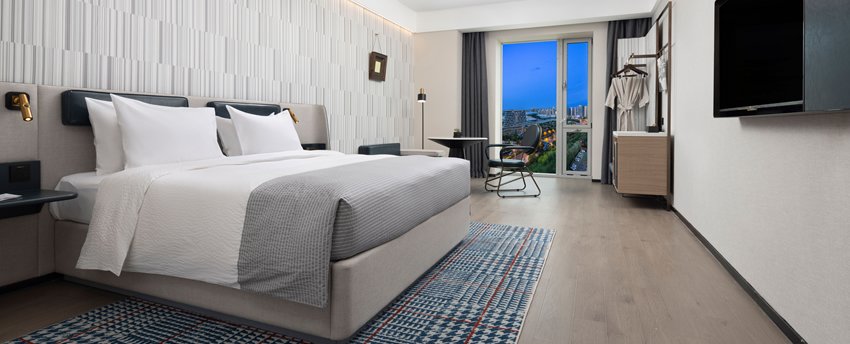 高级豪华大床房位于5-9层,面积43平米,现代简约设计以暖灰色为主,点缀宝石蓝,沉稳大气又时尚不张扬。房间宽敞,卫生间干、湿分离,意大利高端小众洗护品牌Acca Kappa Mini系列洗浴、洗发和护肤用品配合热带雨林式沐浴体验,甄选美标棉织品、国际品牌“斯林百兰”床垫。房内配备TCL50寸超清液晶电视,一键投屏,畅想完美视觉体验。房内空间宽敬,配备衣橱、书桌、沙发,提供免费瓶装水、茶包等,更可体验免费高速无线网络、在线购物商域、智能机器人免费送货,虚拟现实无缝对接