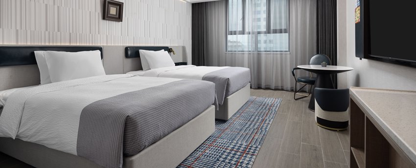 豪华双床房位于3-7层,面积30平米,简欧风设计以暖灰色为主,点缀红色单品,沉稳大气又时尚不张扬。房间宽敞,卫生间干、湿分离,意大利高端小众洗护品牌Acca Kappa 白苔系列洗浴、洗发和护肤用品配合热带雨林式沐浴体验,甄选美标棉织品、国际品牌斯林百兰床垫。房内配备65寸超清液晶电视,一键投屏,畅享完美视觉体验。房内空间宽敞,配备衣橱、书桌、沙发,提供免费瓶装水、茶包等,更可体验免费高速无线网络、在线购物商城、智能机器人免费送货,虚拟现实无缝对接,所有房间均为无烟房。