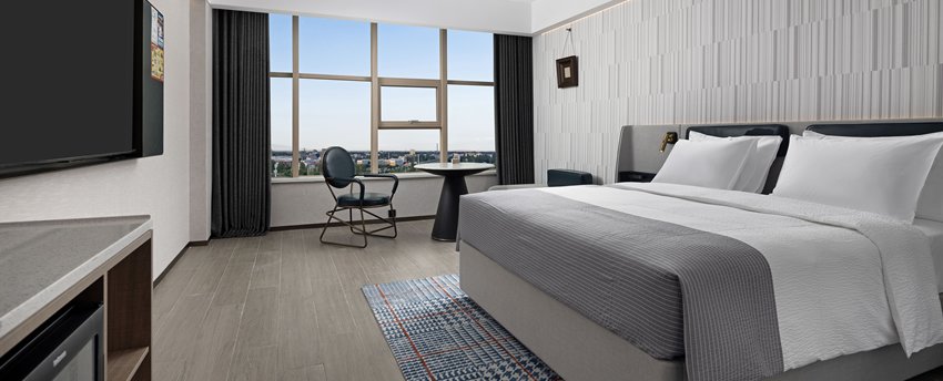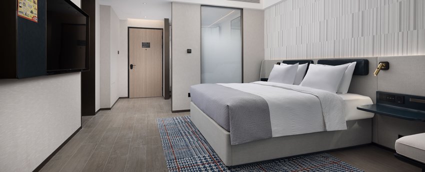 豪华大床房位于3-7层,面积30平米,简欧风设计以暖灰色为主,点缀红色单品,沉稳大气又时尚不张扬。房间宽敞,卫生间干、湿分离,意大利高端小众洗护品牌Acca Kappa白苔系列洗浴、洗发和护肤用品配合热带雨林式沐浴体验,甄选美标棉织品、国际品牌斯林百兰床垫。房内配备65寸超清液晶电视,一键投屏,畅享完美视觉体验。房内空间宽敞,配备衣橱、书桌、沙发,提供免费瓶装水、茶包等,更可体验免费高速无线网络、在线购物商城、智能机器人免费送货,虚拟现实无缝对接,所有房间均为无烟房。