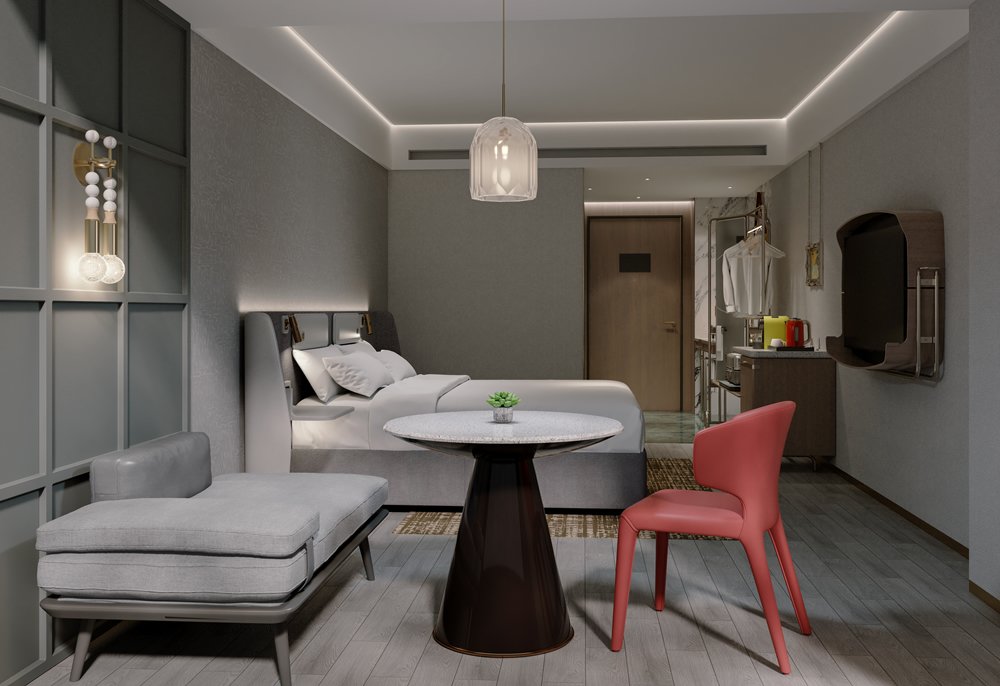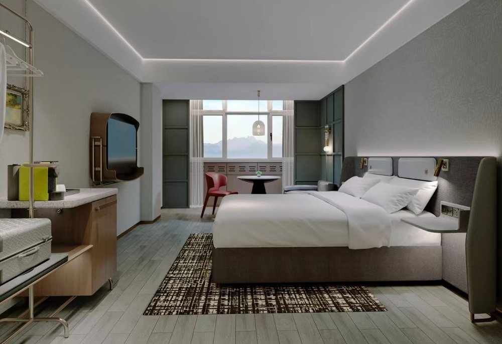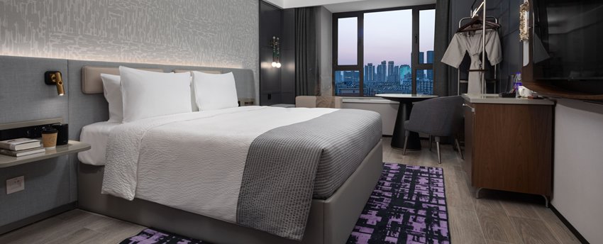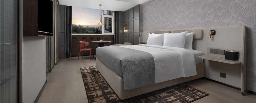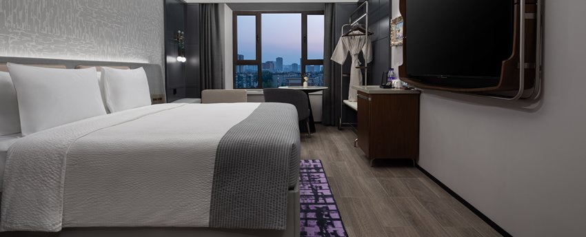 豪华大床房位于3-10层,面积35平米,简欧风设计以暖灰色为主,点缀红色单品,沉稳大气又时尚不张扬。房间宽敞,卫生间干、湿分离,意大利高端小众洗护品牌Acca Kappa白苔系列洗浴、洗发和护肤用品配合热带雨林式沐浴体验,甄选美标棉织品、国际品牌斯林百兰床垫。房内配备65寸超清液晶电视,一键投屏,畅享完美视觉体验。房内空间宽敞,配备衣橱、书桌、沙发,提供免费瓶装水、茶包等,更可体验免费高速无线网络、在线购物商城、智能机器人免费送货,虚拟现实无缝对接,所有房间均为无烟房。