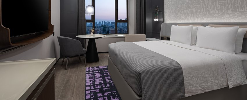 主题榻榻米房位于酒店3-10层,面积40-45平米,简欧风设计以暖灰色为主,点缀红色单品,沉稳大气又时尚不张扬。房间宽敞,卫生间干、湿分离,意大利高端小众洗护品牌Acca Kappa白苔系列洗浴、洗发和护肤用品配合热带雨林式沐浴体验,甄选美标棉织品、国际品牌斯林百兰床垫。房内配备65寸超清液晶电视,一键投屏,畅享完美视觉体验。房内空间宽敞,配备衣橱、书桌、沙发,提供免费瓶装水、茶包等,更可体验免费高速无线网络、在线购物商城、智能机器人免费送货,虚拟现实无缝对接。所有房间均为无烟房。