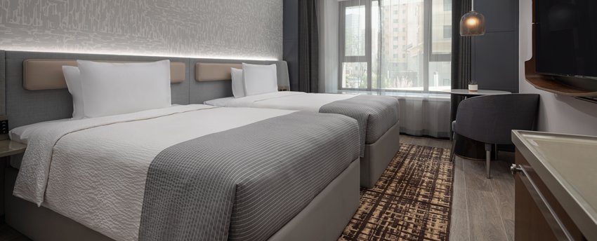 豪华双床房位于3-10层,面积35平米,简欧风设计以暖灰色为主,点缀红色单品,沉稳大气又时尚不张扬。房间宽敞,卫生间干、湿分离,意大利高端小众洗护品牌Acca Kappa 白苔系列洗浴、洗发和护肤用品配合热带雨林式沐浴体验,甄选美标棉织品、国际品牌斯林百兰床垫。房内配备65寸超清液晶电视,一键投屏,畅享完美视觉体验。房内空间宽敞,配备衣橱、书桌、沙发,提供免费瓶装水、茶包等,更可体验免费高速无线网络、在线购物商城、智能机器人免费送货,虚拟现实无缝对接,所有房间均为无烟房。