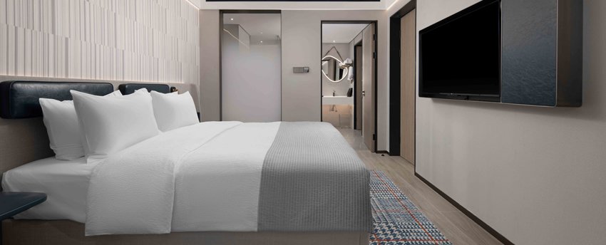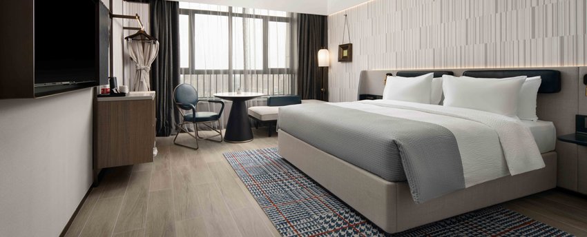 豪华大床房位于9-18层,面积28平方米,现代简约设计以暖灰色为主,点缀宝石蓝,沉稳大气又时尚不张扬。房间宽敞,卫生间干、湿分离,意大利高端小众洗护品牌Acca Kappa白苔系列洗浴、洗发和护肤用品配合热带雨林式沐浴体验,甄选美标棉织品、国际品牌斯林百兰床垫。房内配备TCL50寸超清液晶电视,一键投屏,畅享完美视觉体验。房内空间宽敞,配备衣橱、书桌、沙发,提供免费瓶装水、茶包等,更可体验免费高速无线网络、在线购物商城、智能机器人免费送货,虚拟现实无缝对接。所有房间均为无烟房。