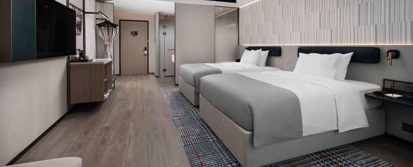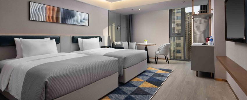 豪华双床房位于11-12层,面积36平方米,现代简约设计以暖灰色为主,点缀宝石蓝,沉稳大气又时尚不张扬。房间宽敞,卫生间干、湿分离,意大利高端小众洗护品牌Acca Kappa白苔系列洗浴、洗发和护肤用品配合热带雨林式沐浴体验,甄选美标棉织品、国际品牌斯林百兰床垫。房内配备TCL50寸超清液晶电视,一键投屏,畅享完美视觉体验。房内空间宽敞,配备衣橱、书桌、沙发,提供免费瓶装水、茶包等,更可体验免费高速无线网络、在线购物商城、智能机器人免费送货,虚拟现实无缝对接。所有房间均为无烟房。