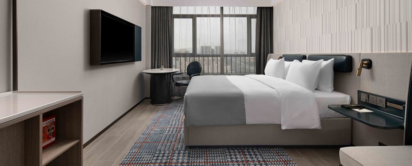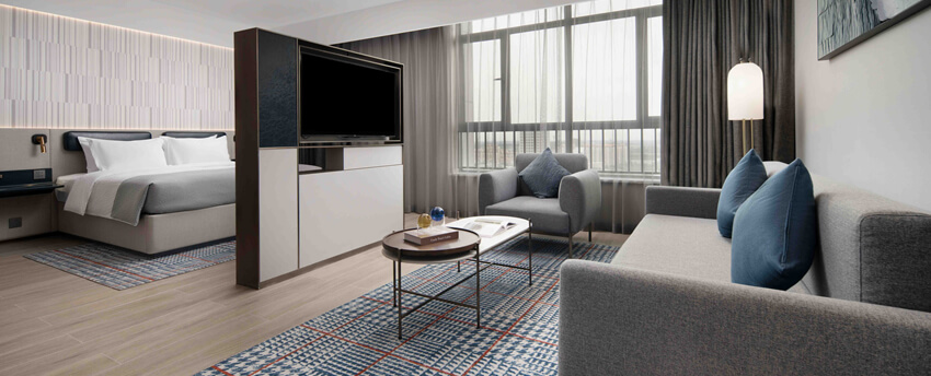 豪华大床房位于9-19层,面积32-36平方米,现代简约设计以暖灰色为主,点缀宝石蓝,沉稳大气又时尚不张扬。房间宽敞,卫生间干、湿分离,意大利高端小众洗护品牌Acca Kappa白苔系列洗浴、洗发和护肤用品配合热带雨林式沐浴体验,甄选美标棉织品、国际品牌斯林百兰床垫。房内配备TCL50寸超清液晶电视,一键投屏,畅享完美视觉体验。房内空间宽敞,配备衣橱、书桌、沙发,提供免费瓶装水、茶包等,更可体验免费高速无线网络、在线购物商城、智能机器人免费送货,虚拟现实无缝对接。所有房间均为无烟房。