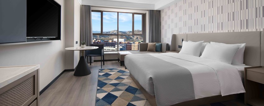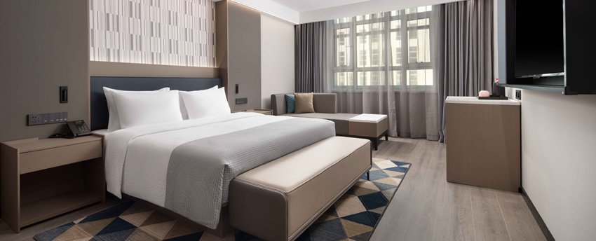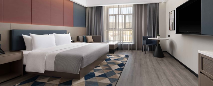 豪华大床房位于3-11层,面积31平米,现代简约设计以暖灰色为主,点缀宝石蓝,沉稳大气又时尚不张扬。房间宽敞,卫生间干、湿分离,意大利高端小众洗护品牌Acca Kappa白苔系列洗浴、洗发和护肤用品配合热带雨林式沐浴体验,甄选美标棉织品、国际品牌斯林百兰床垫。房内配备TCL55寸超清液晶电视,一键投屏,畅享完美视觉体验。房内空间宽敞,配备衣橱、书桌、沙发,提供免费瓶装水、茶包等,更可体验免费高速无线网络、在线购物商城、智能机器人免费送货,虚拟现实无缝对接。所有房间均为无烟房。