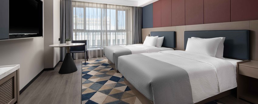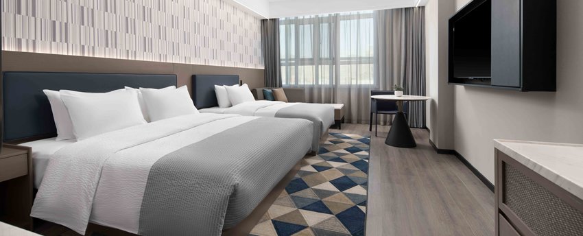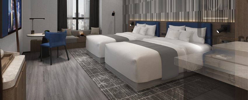 豪华双床房位于3-11层,面积31平米,现代简约设计以暖灰色为主,点缀宝石蓝,沉稳大气又时尚不张扬。房间宽敞,卫生间干、湿分离,意大利高端小众洗护品牌Acca Kappa白苔系列洗浴、洗发和护肤用品配合热带雨林式沐浴体验,甄选美标棉织品、国际品牌斯林百兰床垫。房内配备TCL55寸超清液晶电视,一键投屏,畅享完美视觉体验。房内空间宽敞,配备衣橱、书桌、沙发,提供免费瓶装水、茶包等,更可体验免费高速无线网络、在线购物商城、智能机器人免费送货,虚拟现实无缝对接。所有房间均为无烟房。