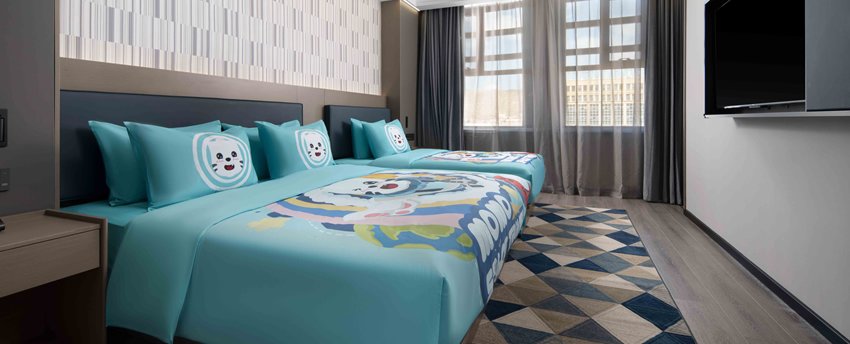 亲子套房位于酒店7、9、11层,面积55平米,现代简约设计以暖灰色为主,点缀宝石蓝,沉稳大气又时尚不张扬。具备独立客厅、独立卧室、两个独立卫生间,开放式客厅,舒适宽敞,以商务简约的现代设计为旅行人士呈现别具一格的休憩空间。卫生间干、湿功分离;意大利高端小众洗护品牌Acca Kappa白苔系列洗浴、洗发和护肤用品配合热带雨林式沐浴体验,配备智能马桶,甄选美标棉织品、国际品牌斯林百兰床垫。房内配备TCL55寸超清液晶电视,一键投屏,畅享完美视觉体验。房间提供保险箱、迷你冰箱、雀巢胶囊咖啡、免费迷你吧,瓶装水、茶包等,更可体验免费高速无线网络,虚拟现实无缝对接。所有房间均为无烟房。