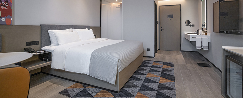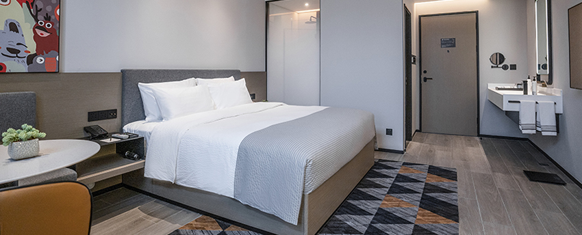 面积:25 ㎡;楼层:1-3层;床型:1.8*2m大床一张;有无窗户:有;上网方式:客房WIFI;房间介绍:豪华大床房位于1-3层,面积25㎡左右,房间舒适宽敞,以时尚个性的后工业风设计为旅行人士呈现别具一格的休憩空间。卫生间干、湿分离,“明辉”定制星级洗护用品配合热带雨林式沐浴体验,甄选美标棉织品、国际品牌“斯林百兰”床垫。房内配备TCL50寸超清液晶电视,一键投屏,畅想完美视觉体验。房间提供免费瓶装水、茶包、挂耳咖啡包等,更可体验免费高速无线网络、智能机器人免费送货,虚拟现实无缝对接,所有房间均为无烟房。