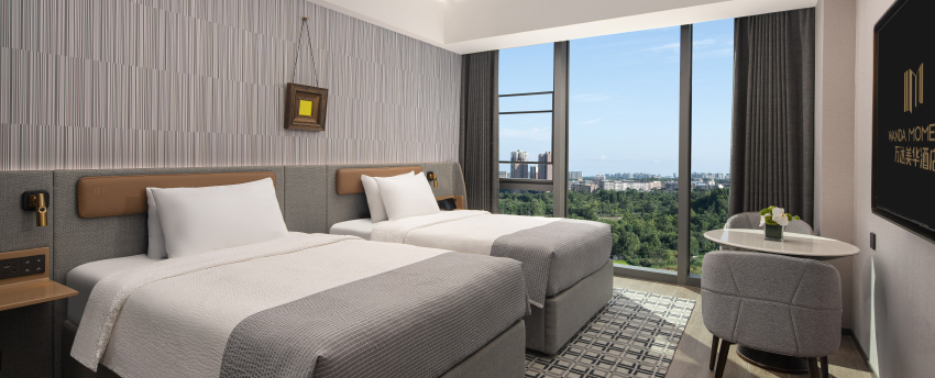 豪华双床房位于6-10层,面积30平方米,现代简约设计以暖白色为主,度假风格,沉稳大气而不失时尚。房间宽敞,卫生间干、湿分离,意大利高端小众洗护品牌Acca Kappa白苔系列洗浴、洗发和护肤用品配合热带雨林式沐浴体验,甄选美标棉织品、国际品牌金可儿床垫。