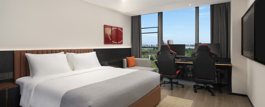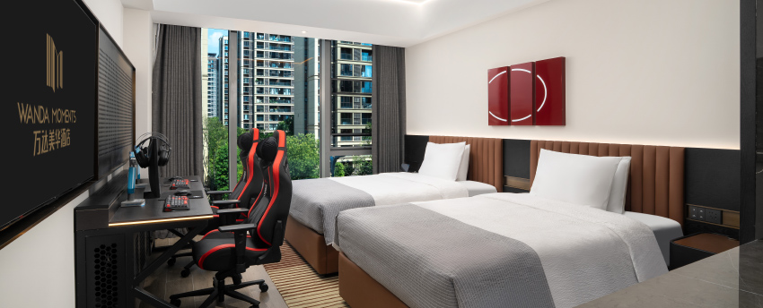 玩陌电竞双床房位于酒店3层、5层,面积30平方米,空间以朋克赛博电竞风设计,金属线条与霓虹灯带勾勒机械美学,沉浸式电竞氛围拉满。配备两张 1.35 米宽舒适床铺,卫生间干湿分离,意大利 Acca Kappa 白苔系列洗护品搭配热带雨林花洒,美标棉织品与斯林百兰床垫加持,硬核电竞风格与惬意休憩体验于此交融。