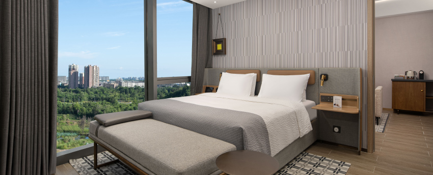 豪华大床房位于6-15层,面积30平方米,现代简约设计以暖白色为主,度假风格,沉稳大气而不失时尚。房间宽敞,卫生间干、湿分离,意大利高端小众洗护品牌Acca Kappa白苔系列洗浴、洗发和护肤用品配合热带雨林式沐浴体验,甄选美标棉织品、国际品牌斯林百兰床垫。