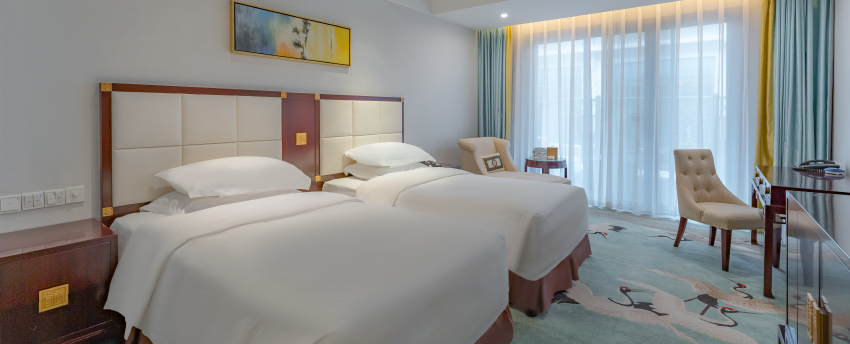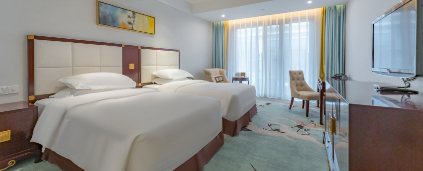 豪华双床房位于酒店2-4层,面积41平米,全部落地阳台,卫生间干、湿分离,国际专业定制洗护用品配合热带雨林式沐浴体验;甄选美标棉织品、国际品牌“金可儿”床垫;房间提供免费瓶装水、茶包、免费高速无线网络,将虚拟与现实交融,畅享“所见即所得”的全新旅居体验;