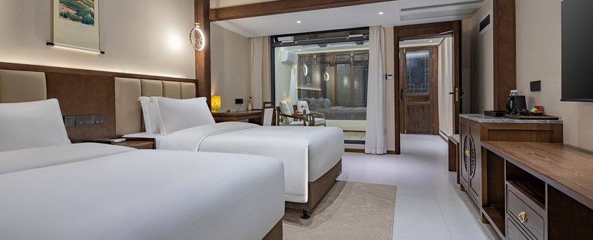 静修·庭苑双床房位于万达美华别院的二层,面积25平方米,房型方正,舒适宽敞,新中式设计,全实木家具,提供独立榻榻米庭院,为旅行人士呈现别具一格的休憩空间。卫生间干、湿分离,精选欧舒丹专业洗护用品。房内配备50寸超清液晶电视,一键投屏,畅享完美视觉体验。房间提供免费瓶装水、功夫茶具等,更可体验免费高速无线网络、免费停车。所有房间均为无烟房
