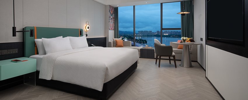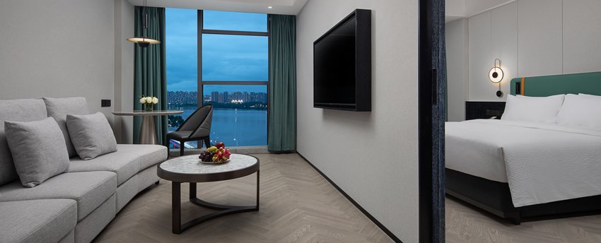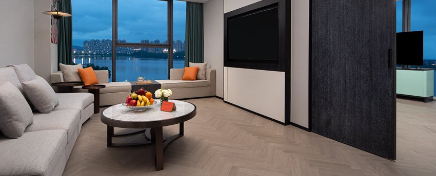 颐华湖景套房位于酒店7层,面积75平米,配套开放式客厅和超大落地窗,坐拥180°湖景景观,宽敞舒适,满足家庭、亲朋聚会等多种需求,以摩登时尚的设计为宾客呈现别具一格的休憩空间;意大利高端小众洗护品牌Acca Kappa白苔系列洗护沐用品配合热带雨林式沐浴体验,甄选美标棉织品、国际品牌床垫。房内配备65寸超清液晶电视,一键投屏,畅享完美视觉体验。房间提供冰箱、免费迷你吧、免费瓶装水、茶包等,更可体验免费高速无线网络、在线购物商城、智能机器人服务,虚拟与现实无缝对接。