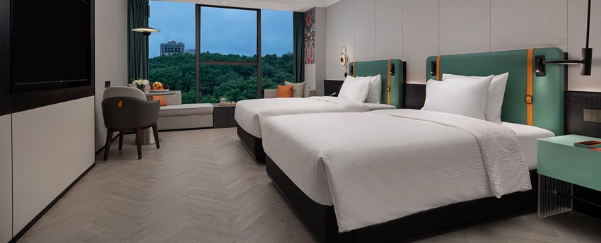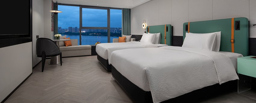 豪华双床房位于酒店3-7层,面积30-35平米,以摩登时尚的设计为商旅人士呈现别具一格的休憩空间,尽享湖景风光;意大利高端小众洗护品牌Acca Kappa白苔系列洗护沐用品配合热带雨林式沐浴体验,甄选美标棉织品、国际品牌床垫。房内配备65寸超清液晶电视,一键投屏,畅享完美视觉体验。房间提供免费瓶装水、茶包等,更可体验免费高速无线网络、在线购物商城、智能机器人服务,虚拟与现实无缝对接。