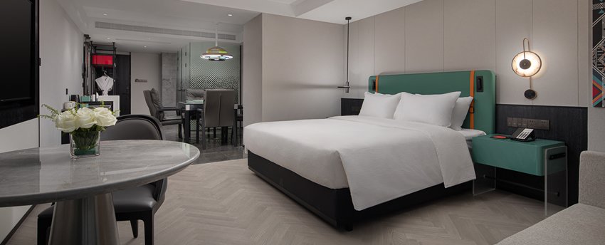 商务套房位于酒店3层,面积60平米,独立客厅和2个卫生间,客房宽敞舒适,以摩登时尚的设计为商旅人士呈现别具一格的休憩空间;意大利高端小众洗护品牌Acca Kappa白苔系列洗护沐用品配合热带雨林式沐浴体验,甄选美标棉织品、国际品牌床垫,房内配备65寸超清液晶电视,一键投屏,畅享完美视觉体验。房间提供冰箱(待核实)、免费迷你吧(待核实)、免费瓶装水、茶包等,更可体验免费高速无线网络、在线购物商城、智能机器人服务,虚拟与现实无缝对接。