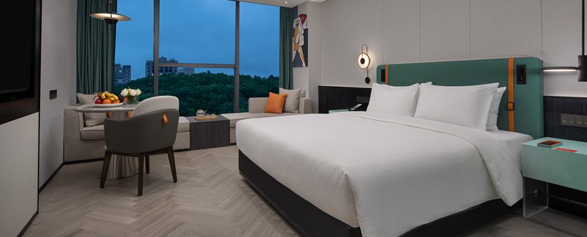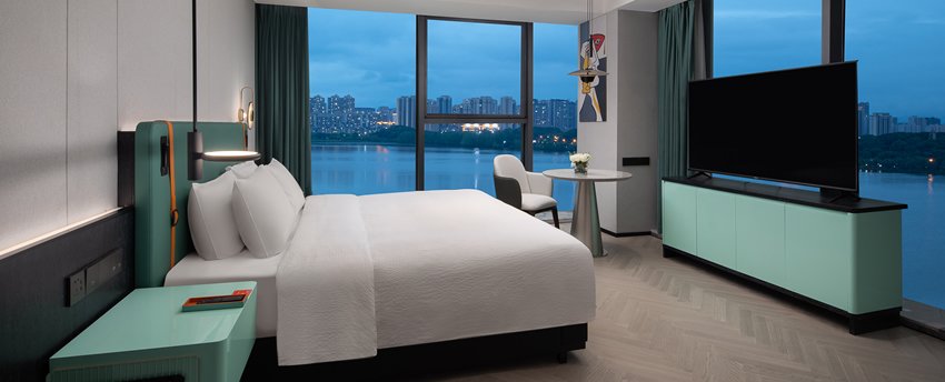 豪华大床房位于酒店3-7层,面积30-35平米,以摩登时尚的设计为商旅人士呈现别具一格的休憩空间,尽享湖景风光;意大利高端小众洗护品牌Acca Kappa白苔系列洗护沐用品配合热带雨林式沐浴体验,甄选美标棉织品、国际品牌床垫。房内配备65寸超清液晶电视,一键投屏,畅享完美视觉体验。房间提供免费瓶装水、茶包等,更可体验免费高速无线网络、在线购物商城、智能机器人服务,虚拟与现实无缝对接。