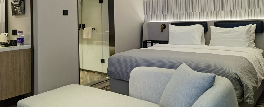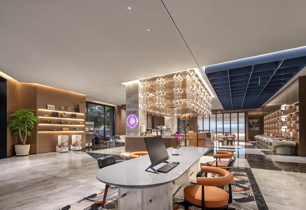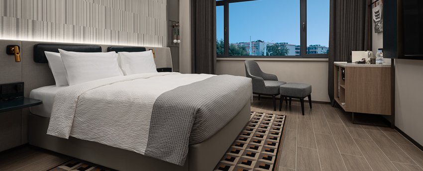 豪华大床房位于2-5层,面积34平方米,现代简约设计以暖灰色为主,点缀宝石蓝,沉稳大气而不失时尚。房间宽敞,卫生间干、湿分离,意大利高端小众洗护品牌Acca Kappa白苔系列洗浴、洗发和护肤用品配合热带雨林式沐浴体验,甄选美标棉织品、国际品牌斯林百兰床垫。房内配备TCL50寸超清液晶电视,一键投屏,畅享完美视觉体验。房内空间宽敞,配备衣橱、书桌、沙发,提供免费瓶装水、茶包等,更可体验免费高速无线网络、在线购物商城、智能机器人免费送货,虚拟现实无缝对接。所有房间均为无烟房。