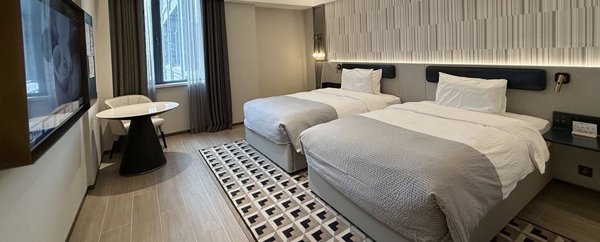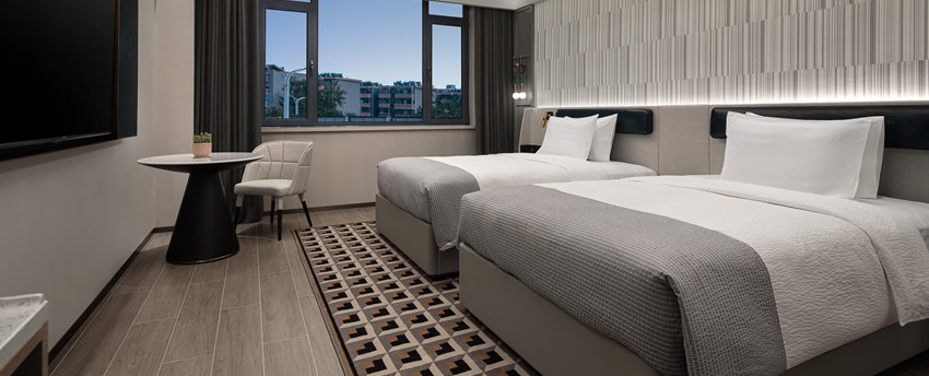 豪华双床房位于2-5层,面积34平米(信息不一致),房间宽敞,设计现代简约,沉稳大气又时尚不张扬,卫生间干、湿分离,意大利高端小众洗护品牌Acca Kappa白苔系列洗浴、洗发和护肤用品配合热带雨林式沐浴体验,甄选美标棉织品、国际品牌斯林百兰床垫。房内配备TCL65寸超清液晶电视,一键投屏,畅享完美视觉体验。房内空间宽敞,配备衣橱、书桌、沙发,提供免费瓶装水、茶包等,更可体验免费高速无线网络、在线购物商城、智能机器人免费送货,虚拟现实无缝对接。所有房间均为无烟房。