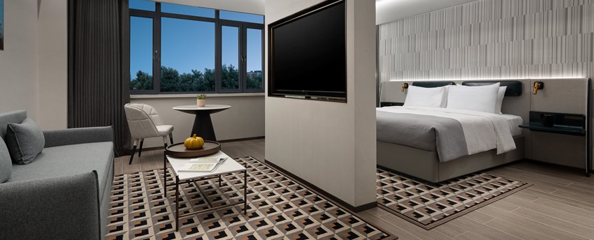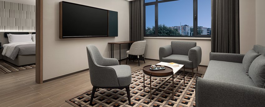 行政套房位于酒店2-5层,面积55-60平米(信息不一致),现代简约设计以暖灰色为主,点缀宝石蓝,沉稳大气而不失时尚。具备独立客厅、独立卧室、两个独立卫生间,开放式客厅,舒适宽敞,以商务简约的现代设计为旅行人士呈现别具一格的休憩空间。卫生间干、湿功分离;意大利高端小众洗护品牌Acca Kappa白苔系列洗浴、洗发和护肤用品配合热带雨林式沐浴体验,配备智能马桶,甄选美标棉织品、国际品牌斯林百兰床垫。房内配备TCL65寸超清液晶电视,一键投屏,畅享完美视觉体验。房间提供提供保险箱、迷你冰箱、胶囊咖啡机、瓶装水、茶包等,更可体验免费高速无线网络、在线购物商城、智能机器人免费送货,虚拟现实无缝对...