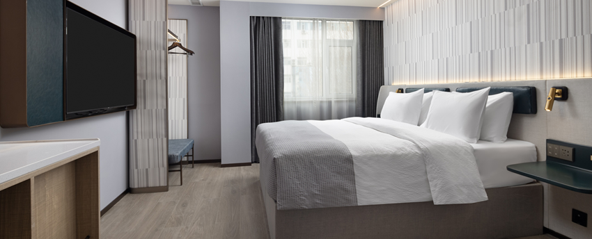 面积:16-20㎡;楼层:3-8层;床型:1.8*2m双人床1张;有无窗户:有;上网方式:客房WIFI;房间介绍:豪华大床房位于酒店3-8层,面积16-20平米,房型方正,舒适宽敞,设计现代简约,沉稳大气又时尚不张扬,为旅行人士呈现别具一格的休憩空间。卫生间干、湿分离,国际专业定制洗护用品配合热带雨林式沐浴体验,甄选美标棉织品、国际品牌斯林百兰床垫。房内配备TCL55寸超清液晶电视,一键投屏,畅享完美视觉体验。房间提供免费瓶装水、茶包等,更可体验免费高速无线网络、在线购物商城、智能机器人免费送货,虚拟现实无缝对接。所有房间均为无烟房。