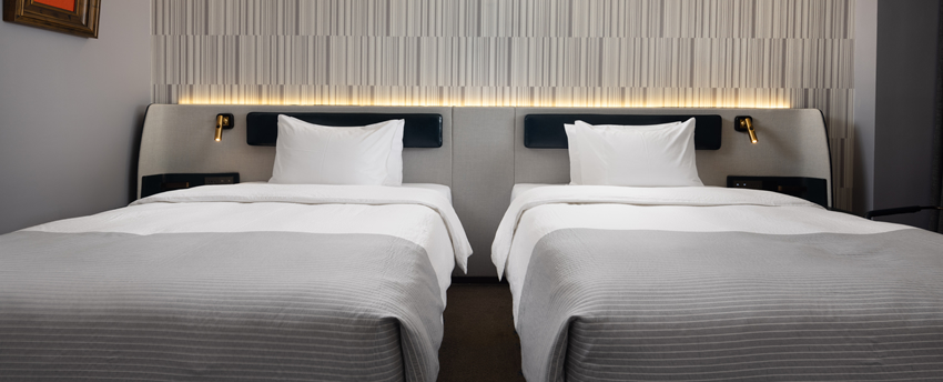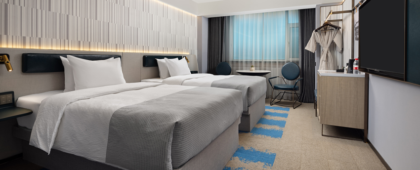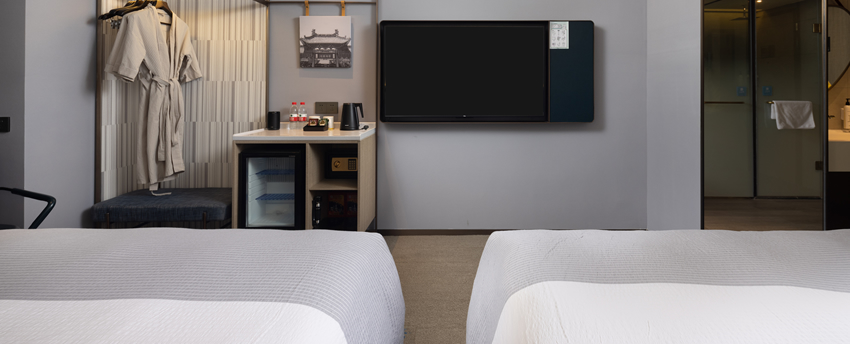 面积:16-20㎡;楼层:3-8层;床型:1.35*2m单人床两张;有无窗户:有;上网方式:客房WIFI;房间介绍:豪华双床房位于酒店3-8层,面积16-20平米,房型方正,舒适宽敞,设计现代简约,沉稳大气又时尚不张扬,为旅行人士呈现别具一格的休憩空间。卫生间干、湿分离,国际专业定制洗护用品配合热带雨林式沐浴体验,甄选美标棉织品、国际品牌斯林百兰床垫。房内配备TCL55寸超清液晶电视,一键投屏,畅享完美视觉体验。房间提供免费瓶装水、茶包等,更可体验免费高速无线网络、在线购物商城、智能机器人免费送货,虚拟现实无缝对接。所有房间均为无烟房。