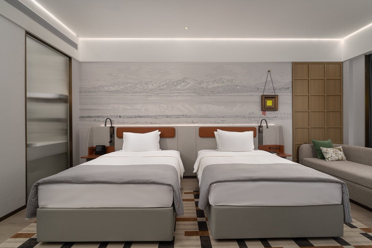 Deluxe twin-bed rooms are a minimum of 40-45square meters and located on the 5th to 6th floors of the hotel. Each room is equipped with a 65-inch LCD TV, shower facilities, a hairdryer, complimentary bottles of water, LAN and wireless Wi-Fi, etc.