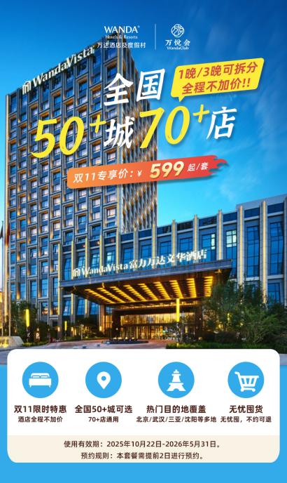 2025年“11.11”大促圆满落下帷幕,万达酒店及度假村再次交出一份亮眼答卷。凭借对消费趋势的敏锐洞察、强大的产品整合能力与全域营销策略,万达酒店在全渠道实现总销售额近4亿元,订单总量突破36万笔,间夜总数超过77万间,展现出强劲的市场号召力。其中,在飞猪旗舰店连续五年国内酒店店铺销售第一,更在多平台实现高质量增长,充分彰显其穿越市场周期的品牌韧性与领先的市场地位。